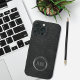 Ein iPhone 13 Gehäuse mit minimalistischem Design und schwarzem Lederhintergrund, der durch silberne Ringe für Ihr Monogramm betont wird, das das Gehäuse dezent schmückt und einen eleganten und modernen männlichen Look schafft.