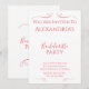 Dies ist ein minimales und modernes, Junggeselinnen-Abschied Einladungs-Design. Es ist in trendroter/rosa Typografie / Text. Auf der Vorderseite steht: "Sie sind zum Junggeselinnen-Abschied von Alexandria eingeladen", mit Informationen über das Datum, den Ort und die UAWG Details darunter. Der Text ist von stilistischen, wirbeligen Herzen gerahmt. Dieses elegante und moderne Design ist perfekt für Ihre Junggeselinnen-Abschied-Feier. Geben Sie einfach Ihre Daten, den Namen von Bride, das Datum, den Ort und die UAWG in das Textfeld ein. Hier können Sie auch die Erholung des Textes ändern, wenn Sie gewollt werden. Um die Farbe oder den Schriftart zu ändern, Karo aus dem Entwurfsbearbeitungsprogramm. Wenn Sie Hilfe bei der Personalisierung oder für ein benutzerdefiniertes Design benötigen, kontaktieren Sie mich per zazzle Chat oder E-Mail: ursuladawnmoon@gmail.com
