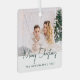 Wünschen Sie Familie und Freunde als besondere Frohe Weihnachten mit diesem modernen minimalistischen Foto Keepsake-Ornament. Der dunkelgrüne Text liest "Frohe Weihnachten" in trendiger Handschrift. Ersetzen Sie das Beispielbild einfach durch Ihr Lieblings-Foto und fügen Sie Ihren Familiennamen oder Vornamen und das unten stehende Jahr hinzu. Ein Bildschirm mit weißem Farbverlauf ermöglicht den Pop des Textüberlagers.