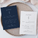 Elegante, schlichte, blaue 12x18" Hochzeitstischmenükarten Flat Dinner Menü in moderner Skriptkalligraphie. Eine Sammlung passender Artikel und Größe 4x9" finden Sie in unserem Shop VelvetPaperCo.