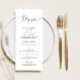 Elegante und minimale Menü-Karte für Hochzeitsessen mit modernem Skripttext.