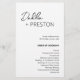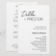 Modernes Schwarz-Weiß-Hochzeitsprogramm mit einem schlichten und minimalen Design mit dem Namen der Braut in einer eleganten Schrift und dem Namen des Bräutigams in einem zeitgenössischen serifenlosen Schriftart. Unten unten rechts finden Sie Ihre Veranstaltungsdetails und die Reihenfolge der Zeremonie in einem minimalistischen Layout. Der Rücken hat Ihre Hochzeitsfeier und danke Ihnen Nachricht.