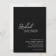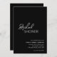 Moderne, schwarze Brautdusche mit einem schlichten und minimalen Design mit dem Veranstaltungstitel in einem eleganten Drehbuch und einem zeitgenössischen serifenlosen Schriftart. Unten unten rechts finden Sie Ihre Veranstaltungsdetails in minimalistischem Layout.