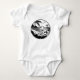This minimalist baby bodysuit features a charming black-and-white illustration of a baby sitting by the beach, surrounded by palm trees and flying birds.