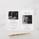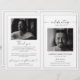 Funeral memorial program featuring on the front a photo of the deceased, thier name, dates, the memorial venue, date of the event, and elegant frame. On the inside is an obituary, and order of service; and on the back another photo, a thank you note and the second venue for after the funeral.
