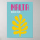 A vibrant and minimalist tribute to the sunny, coastal vibes of Malta. Featuring bold pink text, a stark yellow tropical leaf, and a bright cerulean blue background, this design captures the essence of a beach club vacation. The preppy and retro aesthetic makes it an ideal piece for decorating a travel-themed room, adding a splash of color to a modern apartment, or commemorating a favorite European destination.