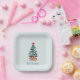 Minimalist mint green Christmas-themed paper plates with a snowy pine tree and a customizable text "Merry Christmas" at the bottom.