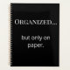 Stay organized in style with this minimalist planner designed for everyday productivity. Featuring the quote “Organized… but only on paper.”, this clean black and white typography design blends humor with a modern aesthetic. Perfect for journaling, office use, or managing your business goals, it keeps your plans in one place. The back cover is customizable, allowing you to add your initial for a personal touch. A stylish and functional gift for professionals, students, or anyone who loves modern organization.