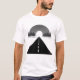 A minimalist black and white t-shirt design featuring a straight road leading toward a glowing moon under a starry night sky, framed by pine trees. Clean, modern, and symbolic artwork inspired by solitude, journey, and cosmic calm. Perfect for lovers of minimalist art, aesthetic fashion, night landscapes, and meaningful graphic tees.