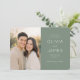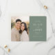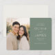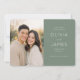 This wedding save the date card features a modern, minimalist design with a split layout. The left side showcases a warm, candid photo of two people against a blurred outdoor backdrop, while the right side is adorned with a solid sage green background and clean, white sans-serif typography. The text is arranged in a vertical hierarchy, emphasizing the names with bold lettering, creating an elegant and contemporary feel. Perfect for couples seeking a stylish yet simple announcement, this design conveys warmth and anticipation for their special day.
