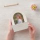 Elegant, clean minimalist style holiday design featuring arch-shaped photo template with thin gold gradient border with editable text fields on a watercolor paper style eggshell background.