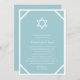 Diese einfache, zeitlose Bar Mitzvah-Einladung besticht durch einen weißen Stern von David, blauen Hintergrund und einen einzigartigen weißen Rahmen. Zusätzliche Informationen und/oder Fotos können auf Wunsch auf der Kartenrückseite hinzugefügt werden.