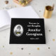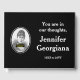 Dieses traurige Bestattungs- oder Denkmalbuch enthält die Meldung "Du bist in unseren Gedanken", einen individuellen Namen und das Datum der Geburt/des Todes. Es enthält auch ein benutzerdefiniertes Foto. Es könnte genutzt werden, um Beileidsbekundungen für die Verwandten und Freunde von jemandem, der vor kurzem verstorben ist, aufzuzeichnen.