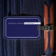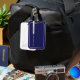 Das dunkelblaue Gepäckanhänger ist mit dem Namen und der Stadt des Reisenden personalisiert... ein modernes und minimalistisches Grafikkonzept.