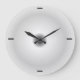 Eine hellgraue, beleuchtete Wanduhr mit schwarzen Linien für vier Hauptziffern. Minimalistisches schlicht modernes Design