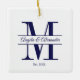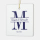 Erstellen Sie Ihre eigene personalisierte dunkelmarineblau-blau-weiß gespaltene mit Monogramm Textgestaltung auf einer quadratischen Keramik Weihnachtsschmuck. Die Schriftart-Paarung ist mit einem hochklassigen Schriftart im schlichten Stil und einer trendigen Kalligraphie ausgestattet. Probieren Sie einen anderen Schriftart oder eine andere Farbe, wenn Sie das Design personalisieren. Persönlich für Braut und Bräutigam. Fügen Sie das Jahr des Hochzeitstages hinzu. Fügen Sie ein Foto für Hochzeiten oder Hochzeitsfeiern hinzu.