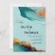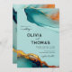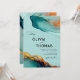 Eine Einladung zur Hochzeit im Herbst, die eine bemalte, abstrakte Aquarellszene mit einem goldenen Farbeffekt (das Gold ist ein digitaler Effekt, keine echte Folie!) in orange und aquamarin und moderner Kalligraphie aufweist. Elegant, schlicht und modern, ist es eine schöne Wahl für eine Herbsthochzeit - oder einfach nur für ein Paar, das Herbstfarben und modernes Design Lieben.
