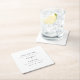 Moderner Save the Date Untersetzer mit minimalem Design mit schwarzen Details auf weißem Hintergrund. Ein schlichtes und modernes Design, das für eine minimalistische Hochzeit ideal ist.