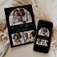 Diese schlichte, minimalistische Save the Date-Karte verfügt über eine 3-Foto-Collage mit einem bogenförmigen Foto oben und zwei kleineren quadratischen Fotos unten. Dazwischen erscheinen die Worte "Save the Date" in elegantem, weißem Handschriftenschreiben, gefolgt von den Namen des Ehepaares, dem Hochzeitstag und der Stadt in Sans Serif Schriftart auf einem schwarzen Hintergrund. Fügen Sie eine detailliertere Nachricht mit weiteren Informationen auf der Rückseite hinzu.