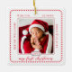 Einfaches und minimalistisches, abgerundetes Quadrat-Foto-Design (gleiches Foto beiderseits) "Meine ersten Weihnachten" mit Name und Geburtsstatistik. Alle Texte und Elemente in rot (Farbe kann geändert werden). Composite Design von Holiday Hearts Designs.