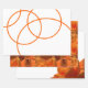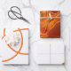 Minimalistische, weiße und orangefarbene Papierbögen mit einem abstrakten Muster orangefarbener Kreise, einem Blumenmuster mit orangefarbener Rose und einem weiteren Bild mit derselben orangefarbenen Rose-Blumenfotografie.