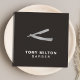Minimalistische, anpassbare Visitenkartenvorlage mit Elfenbeinschwarzhintergrund und Imitaten silberfarbenes Rasiersymbol . Elegantes Design, perfekt für Friseur, Friseur.
