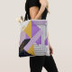 Diese Tasche präsentiert ein elegantes und modernes Design mit geometrischen Elementen, dominiert von einer Kombination aus Lavendel, Gold und schwarzen Tönen. Der zentrale Fokus ist eine große eckige Form, bestehend aus überlappenden Gold- und Lavendeldreiecken und Parallelogrammen. Um diese Form herum gibt es eine Reihe von schwarzen linearen Mustern, die ein Gefühl von Bewegung und Tiefe erzeugen und das Auge in Richtung Mitte führen. Die kontrastierenden Formen und Farben verleihen dem Design eine dynamische, beinahe architektonische Qualität, die es perfekt für diejenigen macht, die einen Geschmack auf zeitgenössische, abstrakte Kunst haben. Die schwarzen Riemen bilden einen subtilen, aber wirkungsvollen Kontrast zu den weichen und kühnen Farbtönen des Designs.