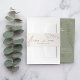 Ein einfaches Hochzeitsbauchband für die Umschläge mit handgezeichnet Eukalyptus-Sprigs auf Elfenbeinhintergrund. Elegante Drehbücher und klassische Serif-Schriftart verbinden sich, um die Namen des Paares und das Hochzeitsdatum hervorzuheben. Ideal für naturlich inspirierte oder minimalistische Hochzeiten mit romantischer Touch.