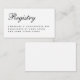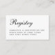 Eine einfache Hochzeitskarte: Nur schwarzer Text auf weißem Hintergrund. Der Titel Registry ist in einem eleganten kalligrafischen Skript geschrieben. Der Text ist verlassen ausgerichtet.