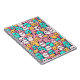 Notebook mit spielerischen, Cartoon-artigen Katzen in Pastelltönen in Rosa, Gelb, Weiß und aquamarin. Die Katzen haben ein minimalistisches Design mit breiten Augen und, ausdrucksstarken Gesichtern, die in einem nahtlosen Muster zusammengehalten sind.