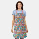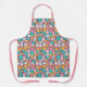 Schürze in spielerischen Katzen im Cartoon-Stil in Pastelltönen in Rosa, Gelb, Weiß und aquamarin. Die Katzen haben ein minimalistisches Design mit breiten Augen und, ausdrucksstarken Gesichtern, die in einem nahtlosen Muster zusammengehalten sind.