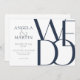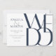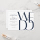 Die einfachen, aber kühnen Einladungen zur Hochzeit von 7" x 5" beinhalten die Worte "Wir tun" in übergroßen marineblau Buchstaben auf neutralem Hintergrund mit marinebasischem und hellgrauem Text für den Sitzhalter des Ehepaares, Datum, Uhrzeit, Veranstaltungsort, Adresse des Veranstaltungsortes mit der Nachricht unten, "Empfang zu folgen".