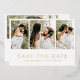 Moderne Hochzeit Speichern Sie die Date Card mit einem einfachen minimalistischen Design und einer Foto-Collage mit Ihren drei Lieblingsbildern. Unten ist "Save the Date" und Ihre Hochzeitsdetails in echter Goldfolie. Fügen Sie mit der Vorlage Ihre personalisierte Nachricht auf der Rückseite hinzu. Diese schicken und stilvollen Save the Date Cards mit minimalem Design erlauben es Ihren Fotos, den Schwerpunkt zu legen.