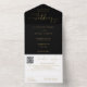 Alles in einer Schwarz-Gold-Hochzeitseinladung mit eleganten Herz-Schrift-Typografie und Monogramm-Initialen. Die Einladung enthält eine perforierte RSVP-Karte mit Ihrem Hochzeitswebseiten QR Code und Details. Entwickelt von Thisisnotme©