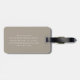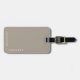 Personalisierter Gepäckanhänger mit Ihren Namen in einem minimalistischen Retro-Schriftart Schreibmaschine in Weiß in der Ecke auf einem taupe braunen Hintergrund.