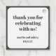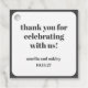 Ein modernes Quadrat dankt Ihnen mit einer kühnen Serif-Nachricht mit dem Text "Danke, dass Sie mit uns gefeiert haben!" in schwarz, zentriert auf einem weißen Hintergrund mit weichen Kanten und personalisierten Namen unten. Dieses Gunst-Tag eignet sich perfekt für Hochzeiten, Brautpartys oder Meilenstein-Feiern - bereit zur Krawatte auf Taschen, Boxen oder Party-Geschenke. Einfach auf jedes Ereignis zugeschnitten.