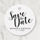 Minimalistisch Wedding Save the Date Favor Tags enthält Titel "Save the Date" in modernem, schwarzen Skript-Schriftart mit Namen und Datum in modernen serifenlosen Schriftart auf weißem Hintergrund.