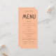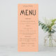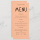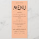 Minimalistische Textpeach Wedding Menu Karte. Verfügbar in digitaler Form und gedruckt. Personalisieren Sie den Text einfach auf Ihre eigenen Daten, die Alternativen für Ihre veganen oder vegetarischen Optionen enthalten. Sie können sich ändern, wenn Sie möchten, irgendwelche Farben Ihrer Wahl, um Ihre Hochzeit Thema.