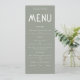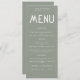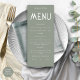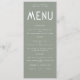 Minimalistisch Text Sage Green Wedding Menu Karte. Verfügbar in digitaler Form und gedruckt. Personalisieren Sie den Text einfach auf Ihre eigenen Daten, die Alternativen für Ihre veganen oder vegetarischen Optionen enthalten. Sie können sich ändern, wenn Sie möchten, irgendwelche Farben Ihrer Wahl, um Ihre Hochzeit Thema.