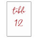 Helfen Sie Ihren Gästen mit dieser eleganten Rot-Weiß-Tischkarte, ihre Sitzplätze zu finden. Die Buchstaben und Zahlen befinden sich in einem Skript-Schriftart.