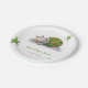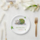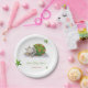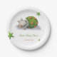 Niedliche neutrale Babyduschpapier-Teller mit einer Abbildung eines Triceratops, der aus seinem Ei schlüpft. Personalisieren Sie es mit Ihren eigenen Informationen. Illustriert und entworfen von Patricia Alvarez.