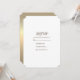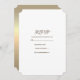 Einfache, raffinierte, zarte goldene Buchstaben in Kombination mit weißem Hintergrund. Minimalistische, moderne, typografische Hochzeitskarte rsvp mit luxuriöser, bezaubernder goldfarbener Rückseite.