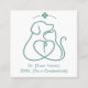 Eine moderne und beruflich anpassbare Visitenkarte für eine Tierklinik. Die Vorderseite der Karte weist ein sauberes, minimalistisches Line-Art-Logo eines Hundes und einer Katze auf, die miteinander verflochten sind, wobei der negative Bereich zwischen ihnen subtil eine Herzform bildet. Über den Tieren ist ein medizinisches Kreuz-Symbol angebracht, das Gesundheit und Pflege anzeigt. Die Rückseite der Karte bietet eine einfache und übersichtliche Anordnung für alle wichtigen Kontaktdaten, einschließlich Klinikdetails, eine individuell anpassbare Liste von Dienstleistungen wie Wellness-Prüfungen und Operation, und einen Raum für den Namen und die Referenzen des Tierarztes. Das Design ist elegant und elegant, ideal für die Schaffung eines vertrauenswürdigen und mitfühlenden Markenimages.