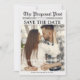 Minimalistische Kalligraphie Zeitungshochzeit erspart das Datum mit drei Fotos, einem Bräutigam und Braut als Kinder und einem als Erwachsene. Tauchen Sie ein in die bezaubernde Geschichte Ihrer Liebe mit Schlagzeilen, die Ihre Reise gemeinsam feiern. Von der Ankündigung der Verlobung bis zum bevorstehenden Hochzeitstag wird jedes Detail geschmackvoll im klassischen Zeitungsformat präsentiert, mit fesselnden Bildern und personalisierten Botschaften.