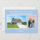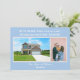 Minimalistische, elegante, trendige, bewegende Ankündigungskarte mit zwei individuellen Fotos, den Familiennamen und dem Text "We ve Moved! Besuchen Sie uns schon bald!" + die neue Adresse und Festnetz-Telefonnummer auf der Vorderseite für Sie personalisieren. Moderner, schicker, puderblauer Hintergrund mit weißer Schrift.