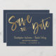 Diese Einladung enthält einen Imitat Goldfolie-Effekt mit marineblau Hintergrund. "Save the Date" erscheint in einem Imitat Goldfolieneffekt, druckt aber keine Goldfolie. Hinweis: "Save the Date" und seine Grafiken können nicht geändert, bearbeitet oder gelöscht werden. Sie können diese Einladung anpassen, indem Sie auf der Kartenrückseite ein Foto hinzufügen, wenn Sie möchten. Sie können die Paarnamen und Text, einschließlich Datum und Ort, personalisieren/anpassen. Sie können sogar die Hintergrundfarbe von marineblau in eine beliebige Farbe ändern.