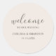 Dies ist ein eleganter, minimaler runder Willkommensaufkleber. Neutrales creme-beiges Hintergrundbild mit zarter grüner Schrift-Typografie, wobei "Willkommen bei unserer Hochzeit" über den Namen von Braut und Bräutigam und dem Hochzeitsdatum geschrieben ist. Einfach und sauber.