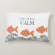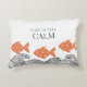 Fangen Sie die Ruhe, Fisch und Wellen werfen Kissen. Die Fische werden in einer weichen Terrakotta-Orange gerendert und mit einem zarten Blumenmuster dekoriert, das eine skurrile, japanisch inspirierte Touch hinzufügt. Die Wellen unten sind illustriert mit feinen schwarzen Linien in einem traditionellen Holzblock-Stil.