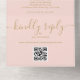 Alle in einer Hochzeitseinladung mit elegantem goldenen Schriftnamen und Monogramm-Initialen auf einem rot-rosa Hintergrund. Die Einladung enthält eine perforierte RSVP-Karte mit Ihrem Hochzeitswebsite QR Code. Entwickelt von Thisisnotme©