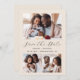 Diese schlichte, minimalistische Save the Date Karte verfügt über eine 3-Foto-Collage mit einem horizontalen Foto oben und zwei kleineren quadratischen Fotos unten. Dazwischen erscheinen die Worte "Save the Date" in elegantem, schwarzen Handschriftenschrift, gefolgt von den Namen des Paares, dem Hochzeitstag und der Stadt in serifenem Schriftart auf beigem Hintergrund. Fügen Sie eine detailliertere Nachricht mit weiteren Informationen auf der Rückseite, zusammen mit einem QR-Code, um Ihren Gästen zu helfen, besuchen Sie Ihre Hochzeitswebsite.